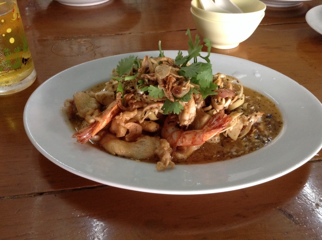 Tom yum soup with fried fish. I was wondering how one could keep fried fish crunchy in a soup, I think it’s because it starts as a dried fish, then fried. Good heat, loaded with lemongrass, kaffir lime leaf and galangal, wonderful.