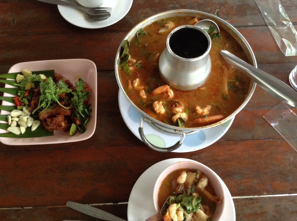 So, we point at a few things, smile, and we have apparently ordered a fried pork appetizer, and a tom yum soup loaded with shrimp- I mean loaded.