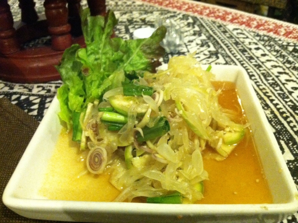 Pomelo Salad. This was a great deviation from the many somtum, or green papaya salads we’ve had. There were large chunks of pomelo, thinly sliced lemongrass. We are going back here for lunch today…. 60 baht.