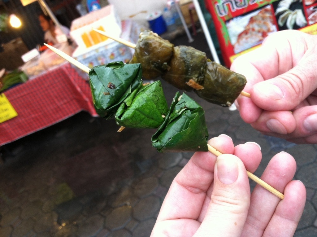 There are 2 kinds here- the bottom one is with the raw la lot leaf, and the upper one is with a blanched leaf. The raw leaf was better, we both agreed. 10 baht for 4. I know the pic has only 3, but what can I say, we are pigs.