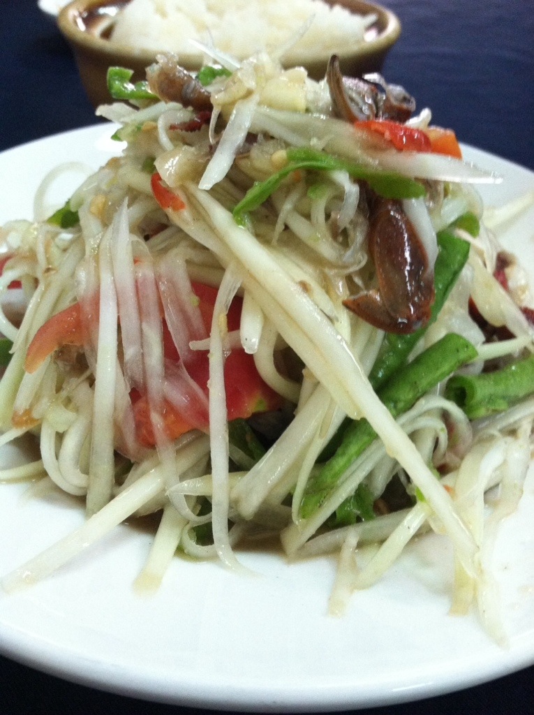 Here’s the winner for best green papaya salad of the market. He gets bonus points for the tiara.