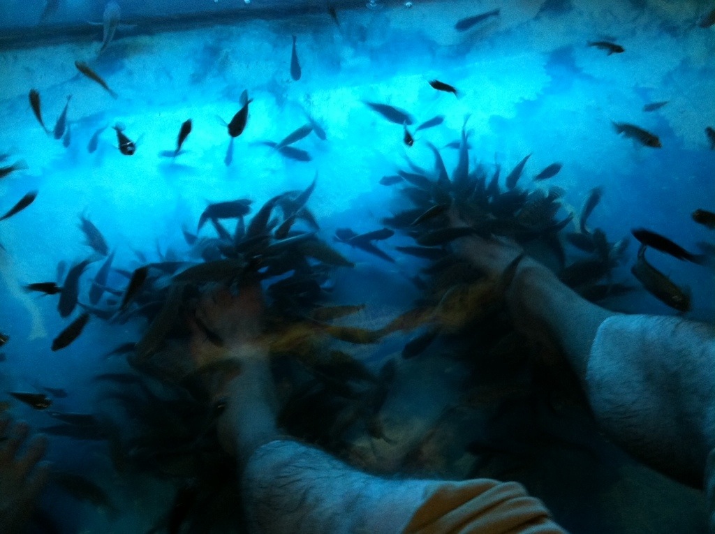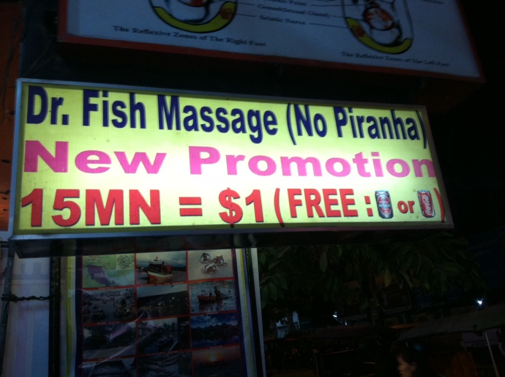 After Miss Wong’s, we walked around the old market area, and I convinced Brent to do this- $1 for a fishy pedicure and a beer or coke, which alone cost… $1, so basically, it’s free fish massage! Or, we are free fish food. Either way. My feet were not as exciting as Brent’s, pictured here. I had to get him to lift his feet from the tank so the fish would come to mine. Despite the fact that this was indeed a silly tourist thing, it was really good. We have been walking lots, and this invigorated and exfoliated our tired dogs. It did tickle like mad for the first minute!