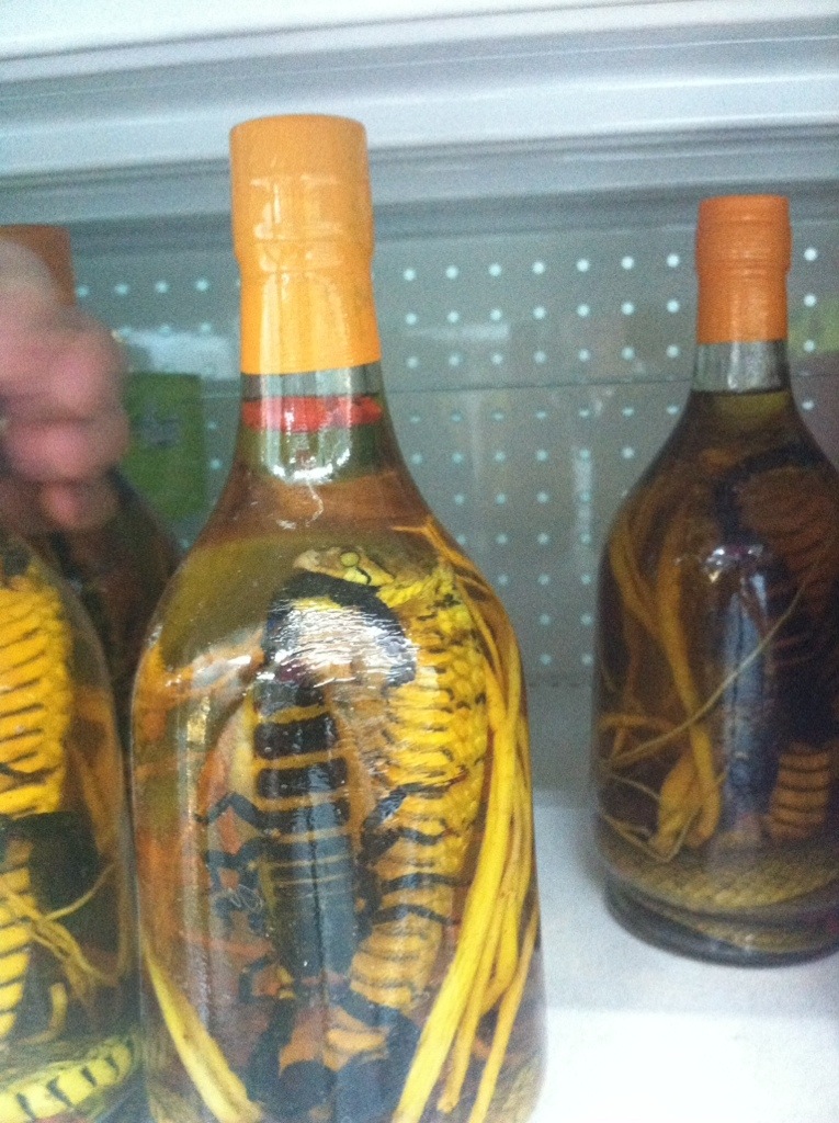 There’s some interesting stuff here. This is a cobra biting a scorpion in whiskey. The good thing is it’s only $4.50 per bottle. No, I won’t get you one. I was so creeped out I couldn’t even touch the bottle.