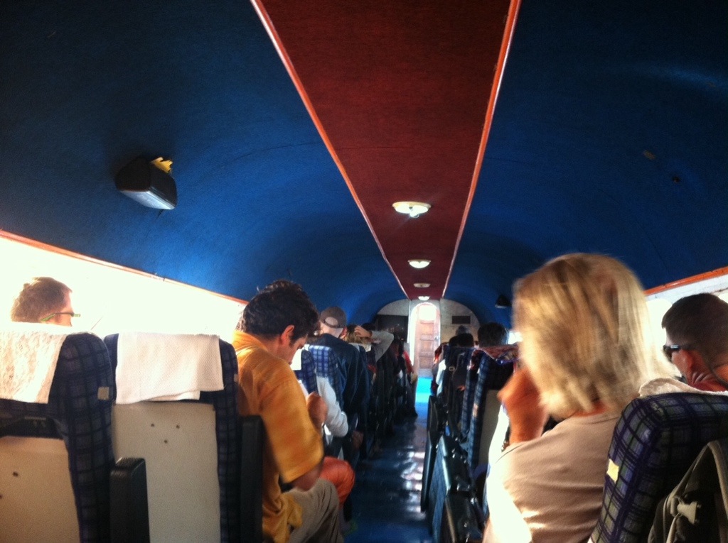 Close quarters, and there was some leaking coming in from one of the welds, so water was shloshing around on the floor of the boat. Bad news for anyone that left items on the floor when they went up top. Atop the tin can was this situation. There’s a guy there on the side with a white shirt on- he’s the porter, of sorts. You can’t see it, but he has a small cooler of beer that he carries around selling at a nice profit.