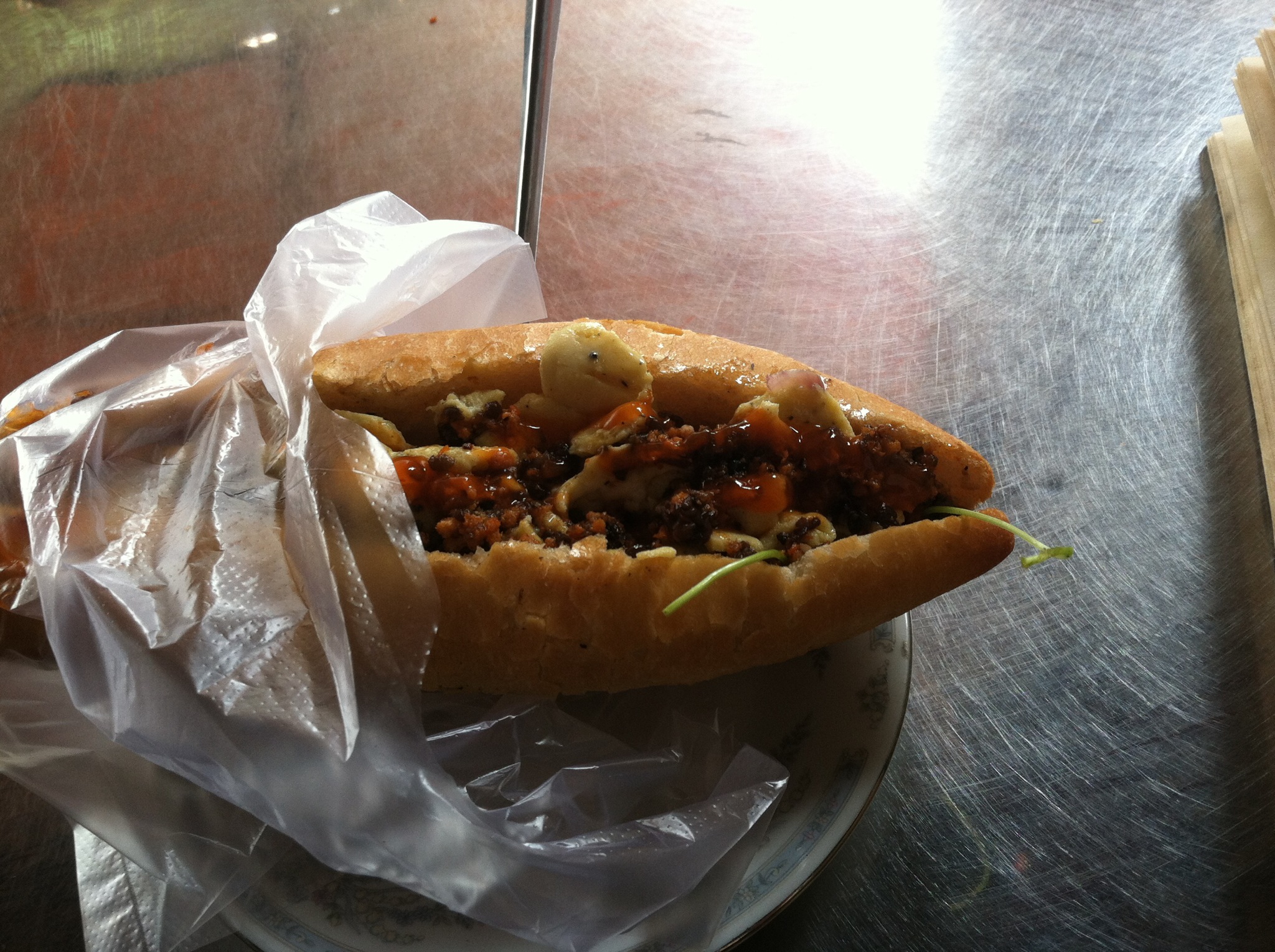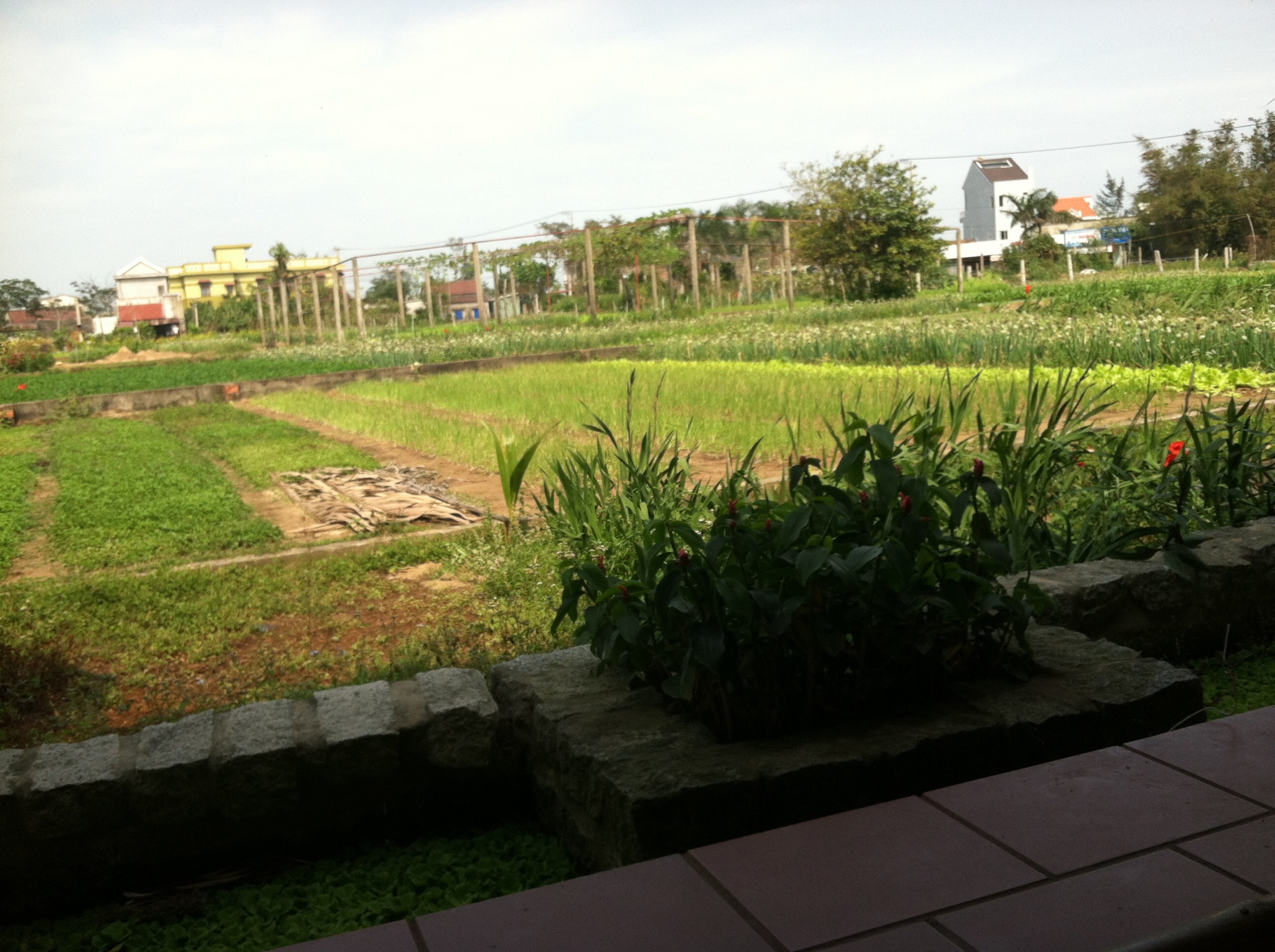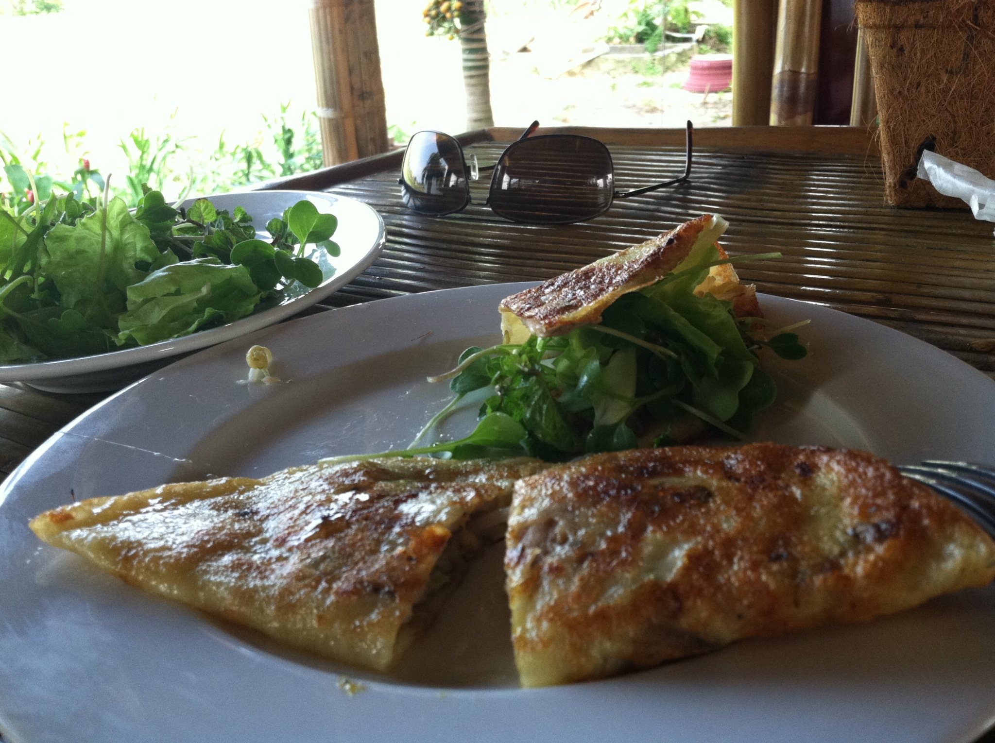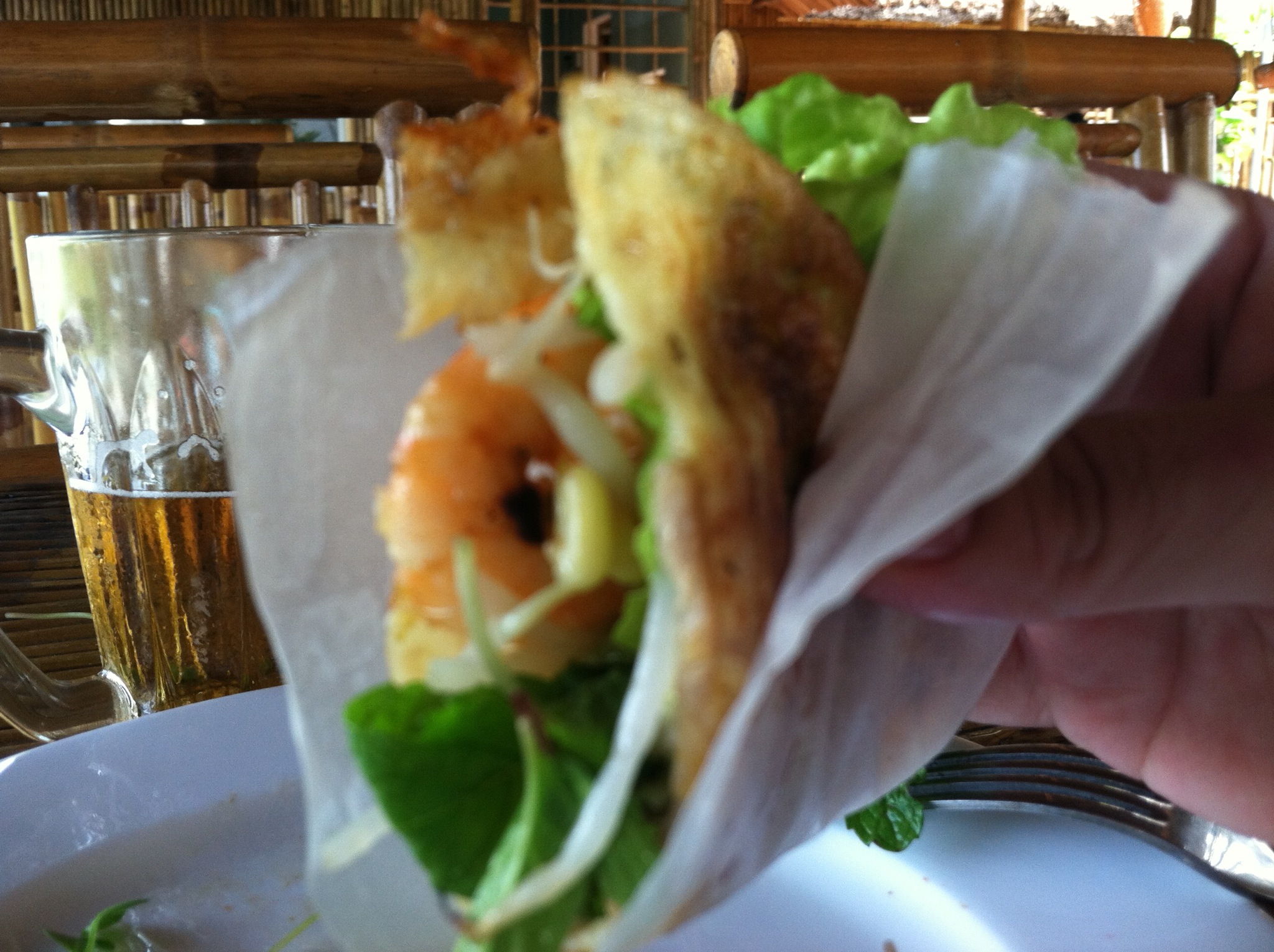 I rented a bike for about $2 for the day, and pedaled out to a restaurant called baby mustard, where I had the Hoi An version of Bahn Xeo- a egg crepe that differs everywhere, depending on the local ingredients. These were smaller than in Rach Gia, and with rice paper to hold it.